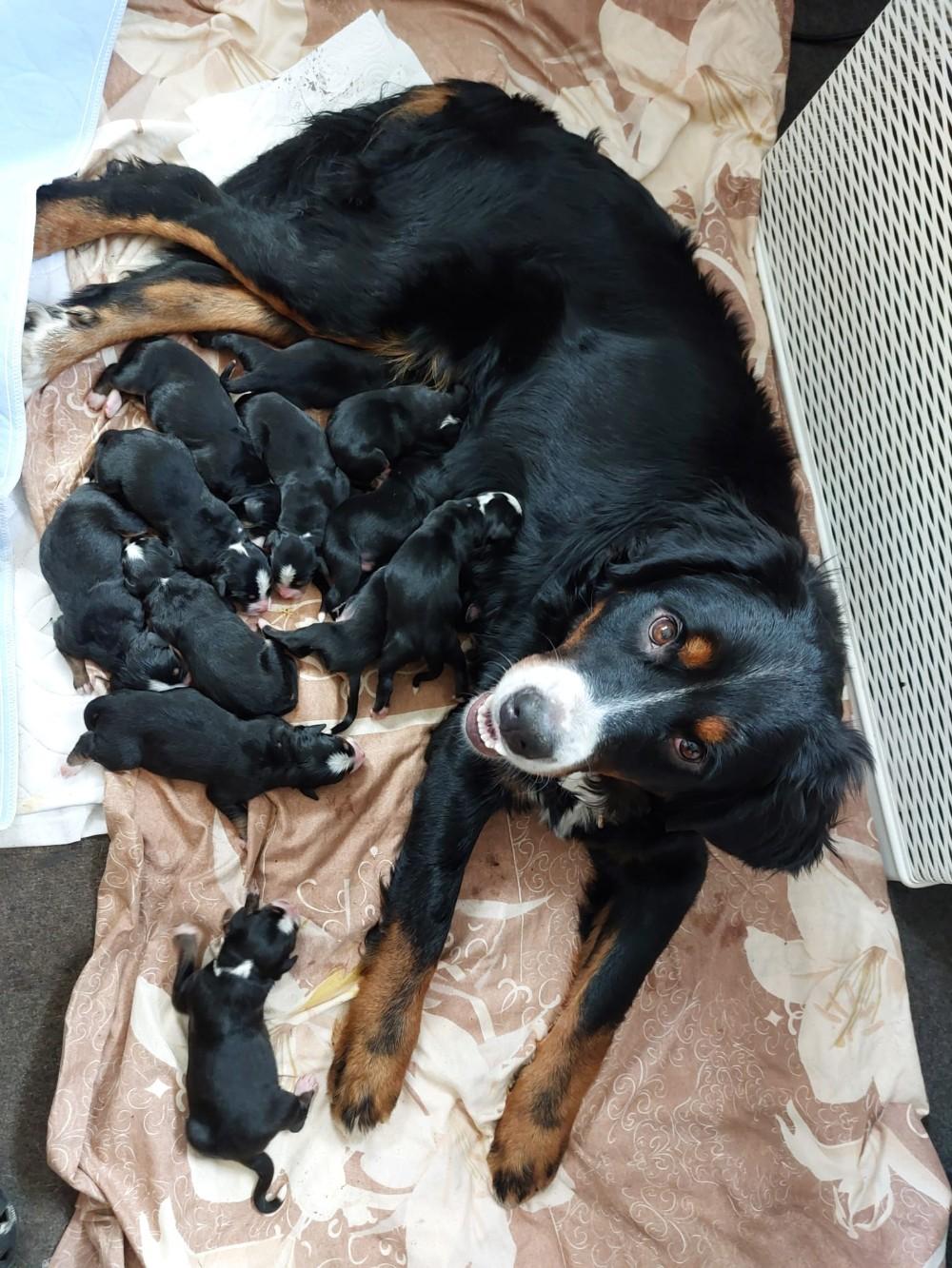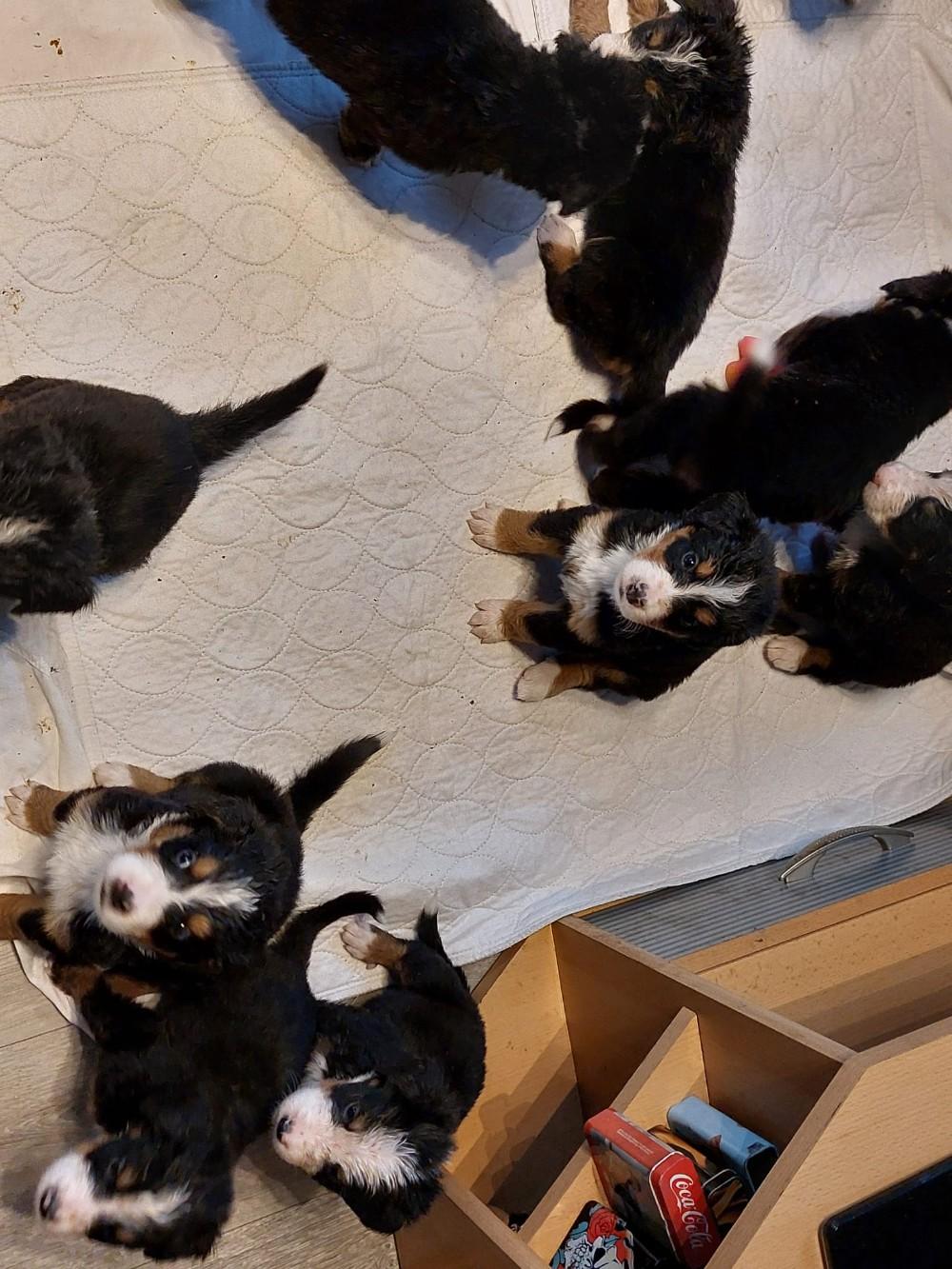 Am 01.09.2025 hat unsere Kelli 12 Gesunde Welpen zur Welt gebracht. Es sind 8 Rüden und 4 Weibchen. Sie wachsen wohlbehütet bei uns in der Familie auf. Unsere Bernis wachsen mit viel Liebe auf. Sie werden an dem Alltag gewöhnt mit andere Hunde und Katzen. Bei Abgabe Termin Anfang November sind die kleinen Racker mehrfach entwurmt und geimpft. Natürlich lebt der stolze Papa auch bei uns. Für unsere Bernis suchen wir eine liebevolle Familie die viel Zeit, Liebe und Zuneigung gibt. Man darf nicht vergessen das sie groß werden und Kuschel Bären sind.