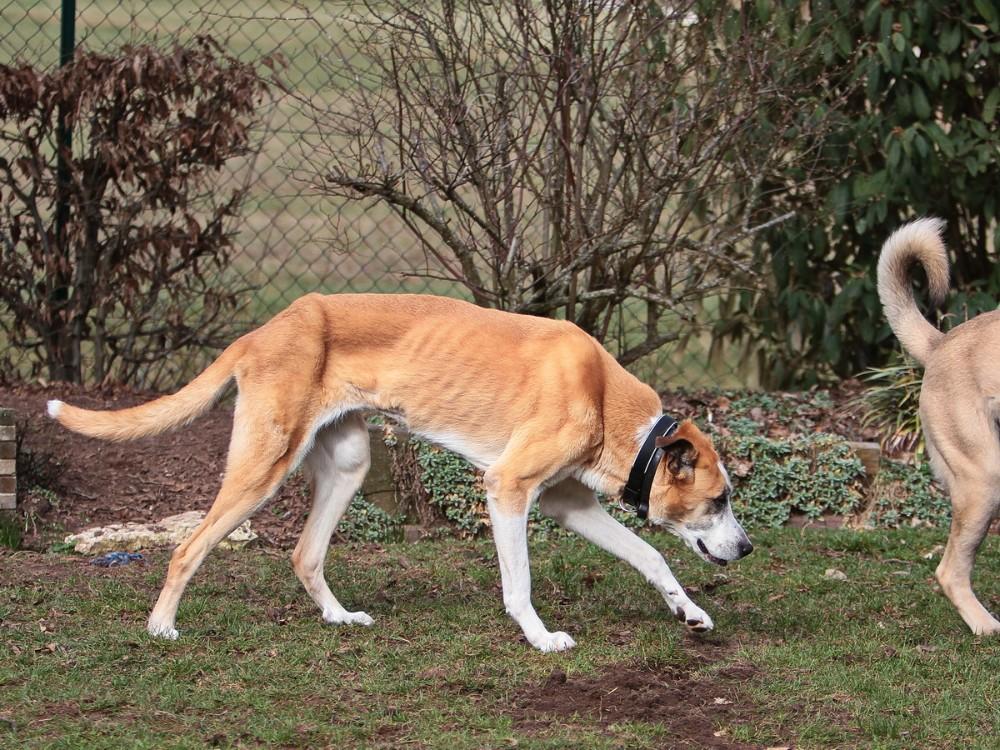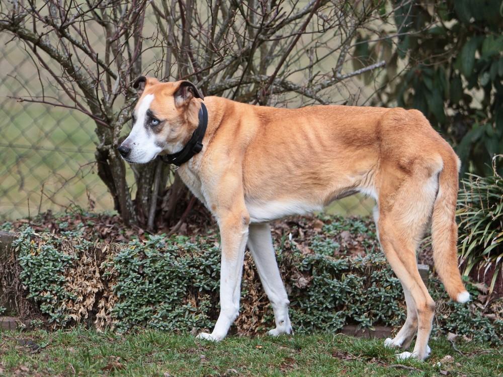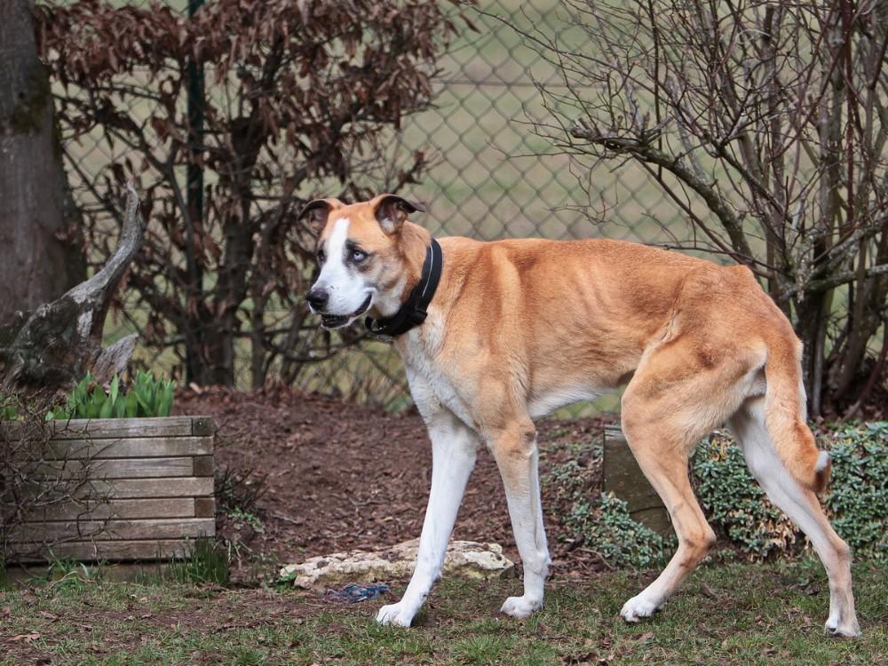 Olimpia, weiblich, kastriert, ca. 74cm, zu dünn, geboren am 03.08.2015, Windhund-Schäferhund-Husky Mischling, ist eine verträglich, liebevolle und sanftmütige Hündin. Olimpia stammt aus schlechter Haltung und wird derzeit auf ihrer Pflegestelle aufgepäppelt. Daher ist sie derzeit noch zu dünn. Da sie aber gut frisst und mehrmals täglich mit Nassfutter und Aufbaupräparaten versorgt wird, nimmt sie bereits zu.